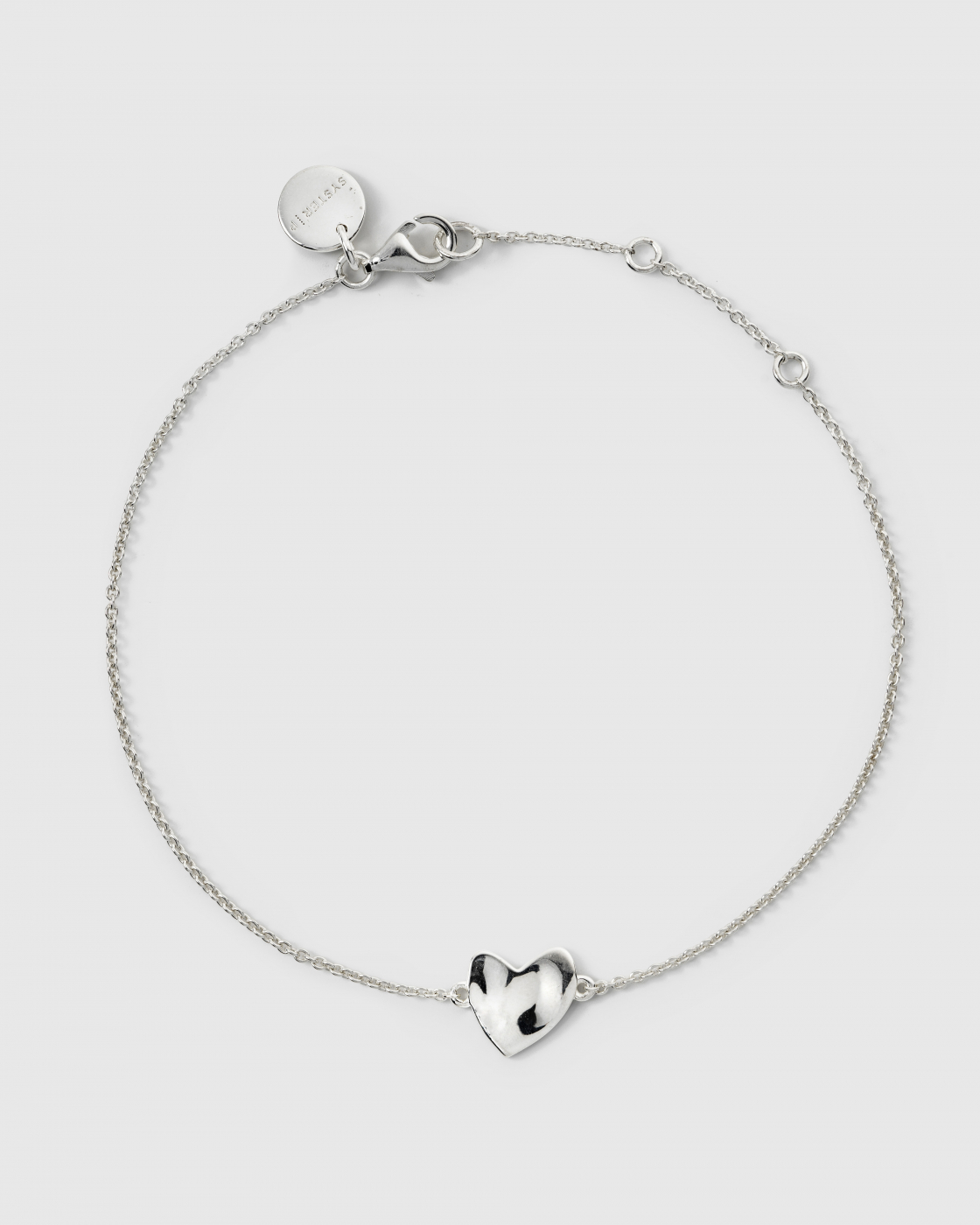 It features a delicate oval chain, handcrafted from 925 sterling silver, 100% recycled. The bracelet has a hammered, sculpted heart — an everyday symbol of love and friendship.