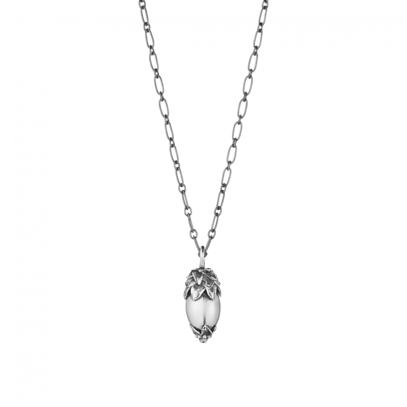 The Heritage collection pays tribute to Georg Jensen's roots in Art Nouveau. For 2026, the collection is extended with a series of new pieces that render homage to the nature-inspired motifs that adorned much of the House's designs from the early 1900s. This refined necklace features delicate, pine cone-like detailing around a silver core — suspended gracefully from a simple chain. The pendant has the launch year engraved on the back, making it a true collector’s item.