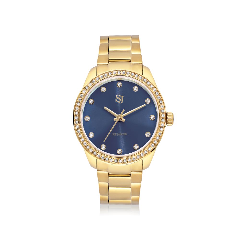 Valeria - Goldpläterad rostfritt stål med mörkblå sunray urtavla och vita zirkoner Klocka